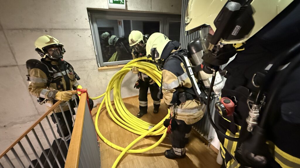 Anschliessend ging es zum Schlauchdienst. Hier wurde zuerst für die neuen Atemschützler erklärt, was sich wo auf dem Tanklöschfahrzeug (TLF) befindet. So erstellen wir den Zubringer und konnten dann direkt ab dem TLF eine erste Leitung in den ersten Stock legen. Es wurde kontrolliert wie wir imTreppenhaus den Schlauch ausgelegt und die Schlauchreserve gebildet haben. Vom Lektionsinhaber wurden dann noch Tipps und Tricks mitgegeben. Im Anschluss wurde noch eine Transportleitung erstellt und ab dieser mittels Schlauchtragkorb und Popcorn ins Gebäude vorgerückt. Eine besondere Herausforderung trat auf, als beim sogenannten “Popcorn” ein Schlauch eine Riss hatte und der Eingangsbereich genässt wurde. Sofort wurde das Wasser angehalten und die Leitung aus dem Raum genommen. Trotz dieses unerwarteten Zwischenfalls, konnten die neuen Atemschützler sehen, wie das Popcorn funktioniert. Ein zentrales Lernziel war hier, dass ein guter Schlauchvorrat im Einsatz ungemein hilft.