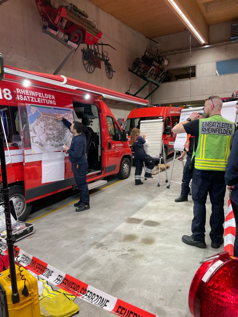 Um das Gehörte und Gelernte gleich umzusetzen, wurde durch die Übungsleitung ein Einsatzleiter und ein Stabschef bestimmt und an alle Teilnehmer die Alarmmeldung bekannt gegeben «Brand-Gross, in Rheinfelden, Explosion und Brand in der Marktgasse, gegenüber Rathaus, verletzte Personen und Brand». Die Teilnehmer wären nun von zu Hause eingerückt und wurden daher durch die Übungsleitung in die Fahrzeughalle geschickt. Der Einsatzleiter und der Stabschef erhielten nun die nötigen Informationen zur «aktuellen Lage» sowie zum «Ereignis». Als Szenario wurde angenommen, dass in der Altstadt von Rheinfelden zwei Gebäude explodiert sind, verschiedene Gebäude in Flammen standen, ein Kleintransportern aufgrund der Explosion verunfallt war und es mehrere Verletzte gab. Nach einer kurzen Absprache erteilte der Einsatzleiter seinem Stabschef den Auftrag einen Einsatzleiterstandort (KP, Kommandoposten) mit den vorhandenen Mitteln einzurichten. Nach dem der Stabschef mit seinem Auftrag losgezogen war, erhielt der Einsatzleiter von der Übungsleitung weitere Informationen von der Situation, welche er am Ereignisort angetroffen hat. Mit diesen Informationen begab sich der Einsatzleiter dann an den Einsatzleiterstandort und informierte dort seinen Stabschef, die Lagekarten- und Journalführung und erteilte die ersten Befehle und Aufträge.