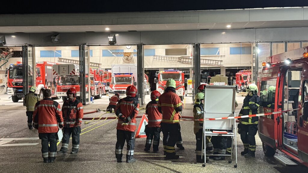 Die letzte Alarmmeldung des Abends traf ein: “Brand-Mittel, in Rheinfelden, Riburgerstrasse 8, Fahrzeugbrand” Einige vermuteten das Gesundheitszentrum Fricktal, doch es war der Schlauchverleger der brannte. Das Szenario gab vor, dass im Obergeschoss zeitgleich eine Party mit 60 Personen statt fand, welche nicht direkt betroffen waren. Die erste Herausforderung war die Einsatzleitung zu bestimmen. Kaum entschieden, wurden Leitungen gelegt und mit den vorhandenen Mitteln versucht, das Feuer unter Kontrolle zu bringen. Unterstützung wurde fiktiv aus Badisch Rheinfelden, Frick und Möhlin angefordert.