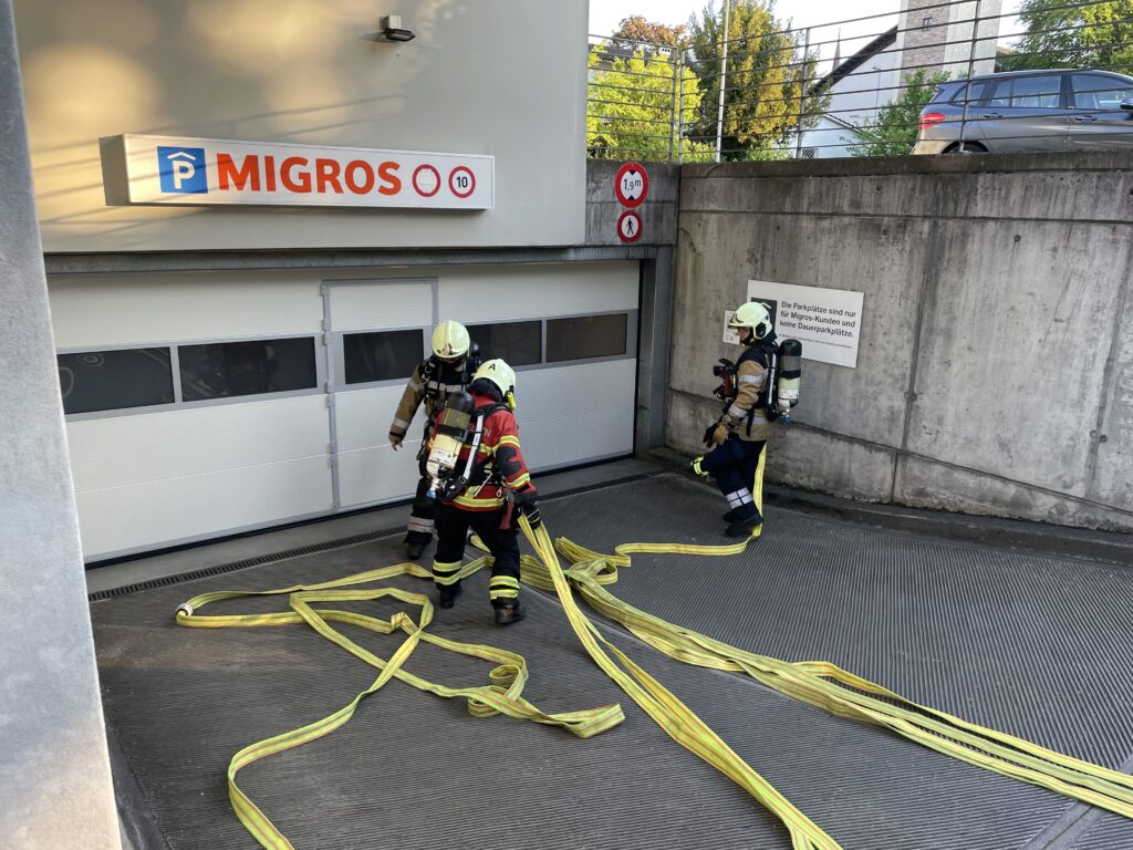 Der Einsatzleiter fuhr mit dem Einsatzleiterfahrzeug voraus und wies das Tanklöschfahrzeug sowie den Atemschutzbus ein. Kurz darauf fanden wir uns in der verrauchten Einstellhalle der Migros wieder. Obwohl man dort schon mehrfach geparkt hat, ist es etwas ganz anderes, wenn man keine Sicht hat und vermisste Personen sowie das Feuer suchen muss.