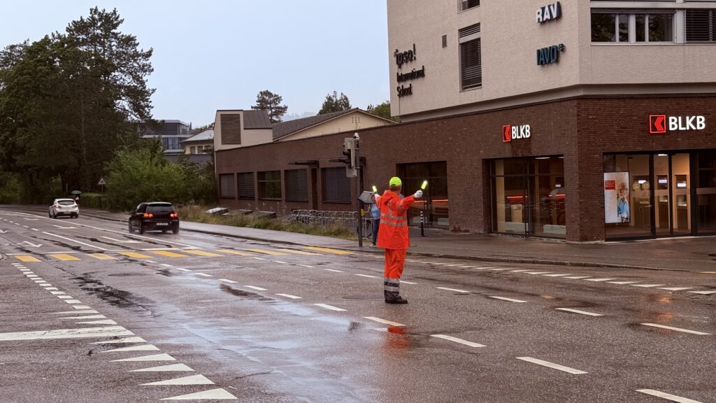 Am Mittwoch fand in Rheinfelden eine praktische Übung zur Verkehrsregelung statt. Da die Anzahl der Teilnehmer überschaubar war, konnte das Programm flexibel an die Wünsche der Teilnehmer angepasst werden. Im Fokus stand die Verkehrsregelung und so entschied sich die Gruppe dafür, den Verkehr auf der Bahnhofskreuzung zu regeln. Die Kreuzung am Bahnhof bietet alles was man dafür braucht: Öffentlicher Verkehr, Fussgänger und natürlich auch Individualverkehr.