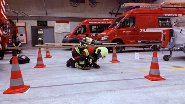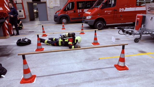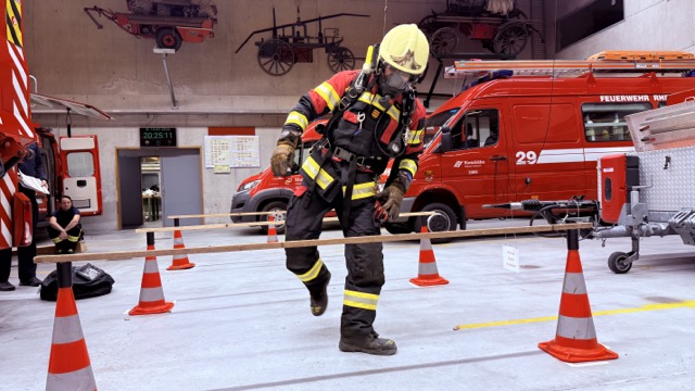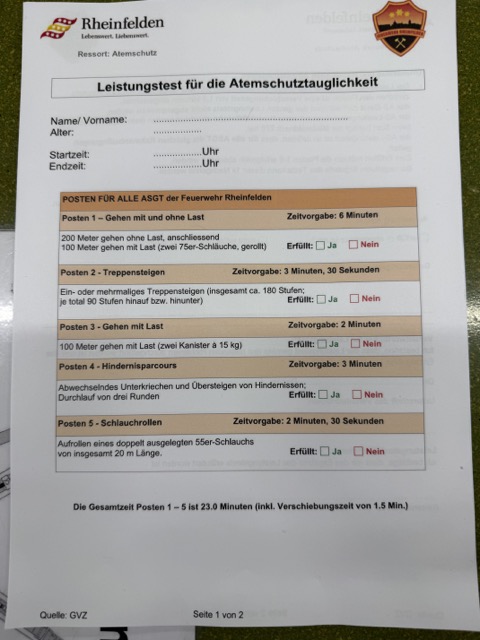 Zu Beginn wurden alle Teilnehmenden begrüsst und über den Ablauf informiert. Die Übungsleitung stellte anschliessend sämtliche Posten des Leistungstests vor und erklärte deren Anforderungen sowie die korrekte Durchführung. Dazu gehörten unter anderem Gehen mit und ohne Last, Treppensteigen, Hindernisparcours, Lastentransport und Schlauchrollen. Nach der Einführung wurde in Zweiergruppen gearbeitet: Jede Gruppe absolvierte nacheinander alle Posten. Für den gesamten Test stehen 23 Minuten zur Verfügung, die meisten Teilnehmenden meisterten ihn in beeindruckenden 15 Minuten. Die Posten überprüfen die körperliche Kraft und Ausdauer.