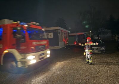Nachdem die Leitern wieder auf den Fahrzeugen verstaut waren, ging es weiter zum TLF Einsatz. Auch an diesem Posten haben sich zwei relativ neue Gruppenführer versucht. Der Kommandant hatte nach den Vorgaben der Postenchefs einen Brand ausgelegt. Ein Fahrzeugbrand bei einem Holzschopf war die Meldung, welche der ausgewählte Einsatzleiter erhielt. Der Einsatzleiter fuhr voraus und konnte sich als Erster ein Bild der Lage machen, bevor das TLF auf Platz war und eingewiesen wurde. Es wurden Druckleitungen verlegt, um den Brand zu bekämpfen. Nach rund 20 Minuten war Übungshalt. Nach einer kurzen Besprechung durch die Postenchefs ging es ans Retablieren. Dem Einsatzleiter wurde direkt ein nächster Brand gemeldet. So musste beim Retablieren ein Zahn zugelegt werden, um ein paar Strassen weiter beim Sägewerk brennende Baumstämme zu bekämpfen. Vor Ort wurden Transportleitung, Druckleitung und der Zubringer gelegt. Auch der Kommandant hat es sich nicht nehmen lassen, einen Schlauch auszurollen und ans Strahlrohr zu gehen.